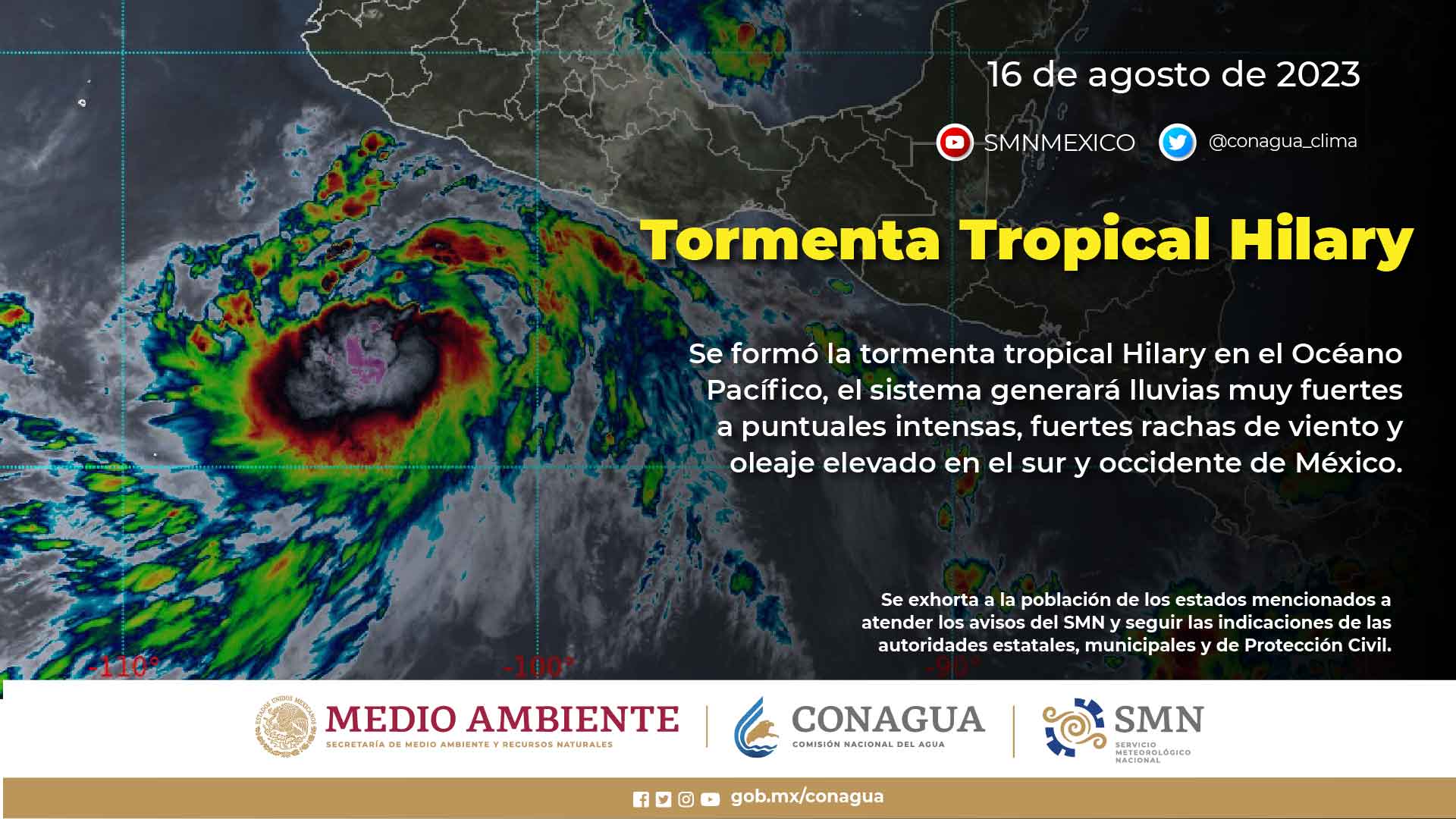 A las 15:00 horas, tiempo del centro de México, la tormenta tropical Hilary se ubicó a 495 kilómetros (km) al sur de Lázaro Cárdenas, Michoacán, y a 590 km al sur de Manzanillo, Colima, con desplazamiento hacia el oeste-noroeste a 24 kilómetros por hora (km/h), vientos máximos sostenidos de 65 km/h y rachas de 85 km/h.