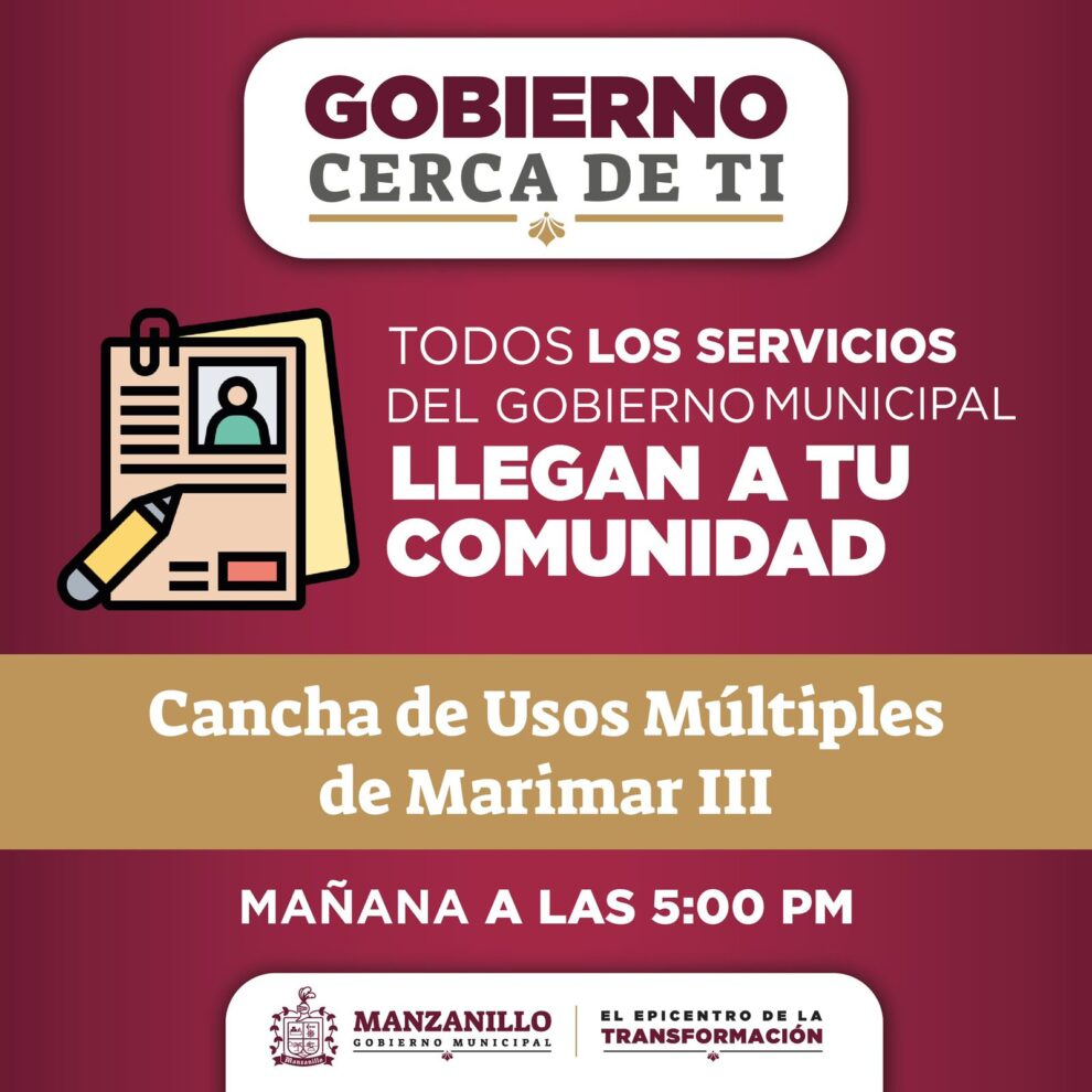 La presidenta municipal de Manzanillo, Rosi Bayardo, invita a las y los vecinos de Marimar lll a la próxima feria de servicios municipales “Gobierno Cerca de Ti” que se realizará mañana 5 de diciembre, a partir de las 5 de la tarde en la Cancha de Usos Múltiples.