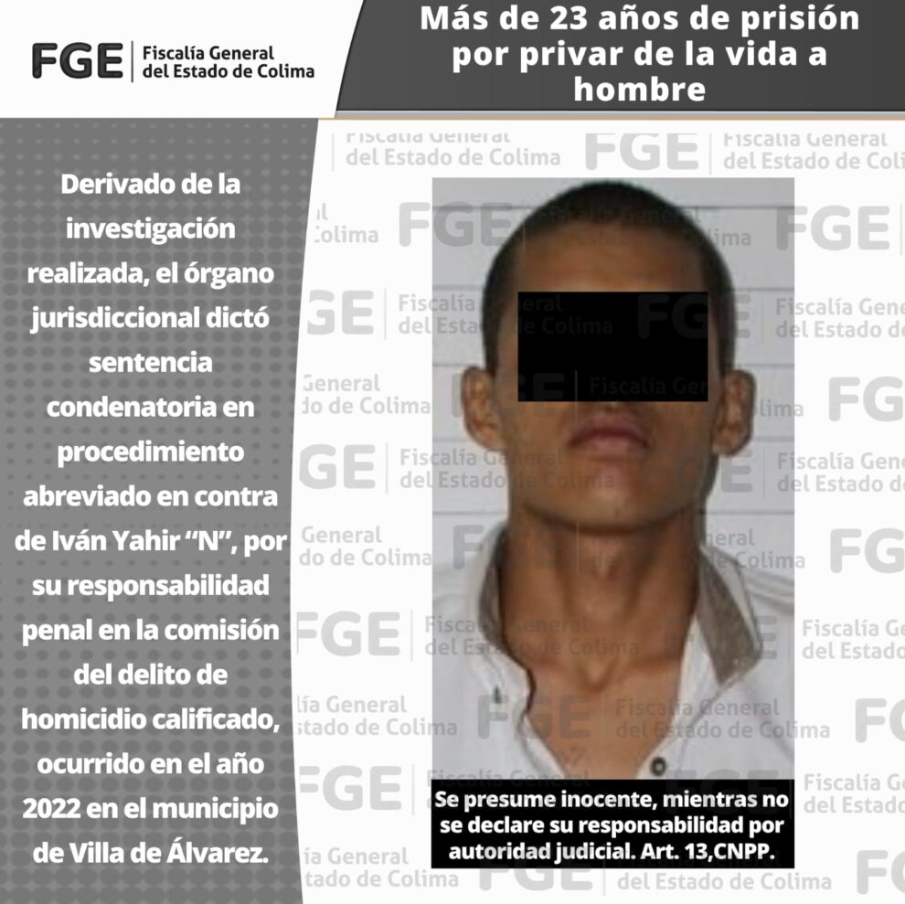 Derivado de la investigación realizada, el órgano jurisdiccional dictó sentencia condenatoria en procedimiento abreviado en contra de Iván Yahir “N”, por su responsabilidad penal en la comisión del delito de homicidio calificado, ocurrido en el año 2022 en el municipio de Villa de Álvarez.