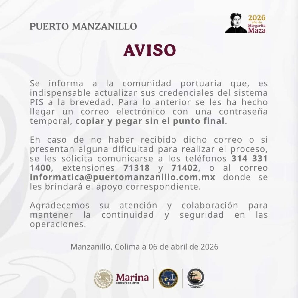 La Administración del Sistema Portuario Nacional Manzanillo emitió este 6 de abril un aviso dirigido a la comunidad portuaria en el que solicita la actualización inmediata de credenciales del sistema Puerto Inteligente Seguro (PIS), herramienta clave para el control de accesos en el recinto.